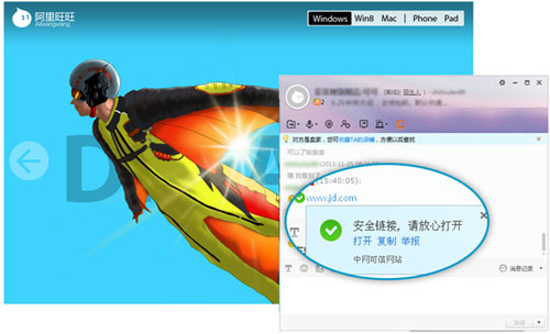 国内第二大即时通讯工具——阿里旺旺,已全面融合“可信网站”验证 ,阿里旺旺用户在聊天框中接收他人发送的网址、链接时,凡 是通过 “可信网站”验证的正规网站,将会有专属安全提示,同时,还允许阿 里旺旺点击查验网站真实身份信息。